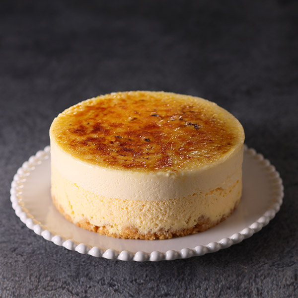 ブリュレチーズケーキ<煌めくキャラメリゼ>は、質の高いバターの原料として知られる北海道根釧地区の生乳を使用しています。1層目にはクリームチーズを焼き上げたベイクドチーズケーキをベースに、2層目にはなめらかなくちどけのマスカルポーネのレアチーズを重ねています。さらに、表面にはほろ苦いキャラメリゼをコーティングし、食感と風味にアクセントを加えています。贅沢な食感のコントラストと、煌びやかな見た目が楽しめる一品です。